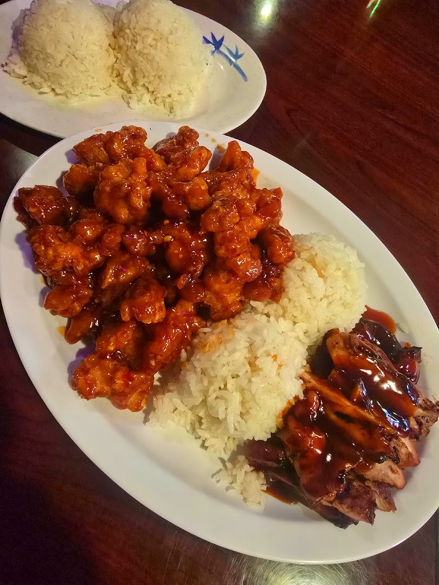 Got the general chicken and teriyaki chicken combo with an extra side of rice. Portion size is amazing. Saved half for lunch the next day, which was bomb! Service is nice. I like the owners personality. She spicy!
